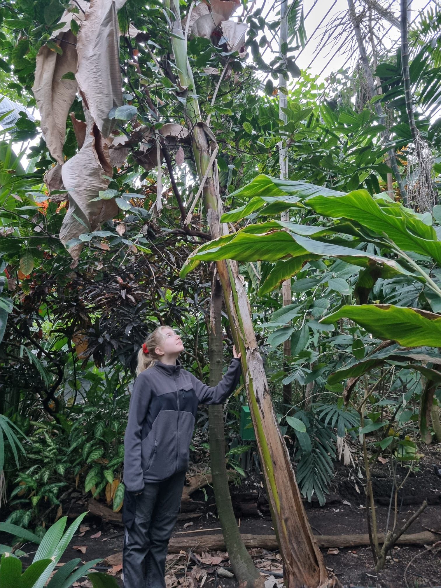 Zu unseren Aufgaben zu Beginn gehörte vor allem das Aufsammeln und Entsorgen von Pflanzenresten sowie das Gießen der Pflanzen. Dabei wurde teilweise das gesamte Tropenhaus bewässert, was die Regenwaldatmosphäre verstärkte. Mehrere Pflanzen wurden auch zurückgeschnitten, unter anderem aufgrund ihres starken Wachstums oder ihrer Rhizome. Für manche Pflanzen, wie die Aristolochia grandiflora oder den Ficus, waren wir auf der Balustrade, um diese zurückzuschneiden und zu sägen. Von dort aus hatte man auch einen schönen Blick auf die tropischen Pflanzen.